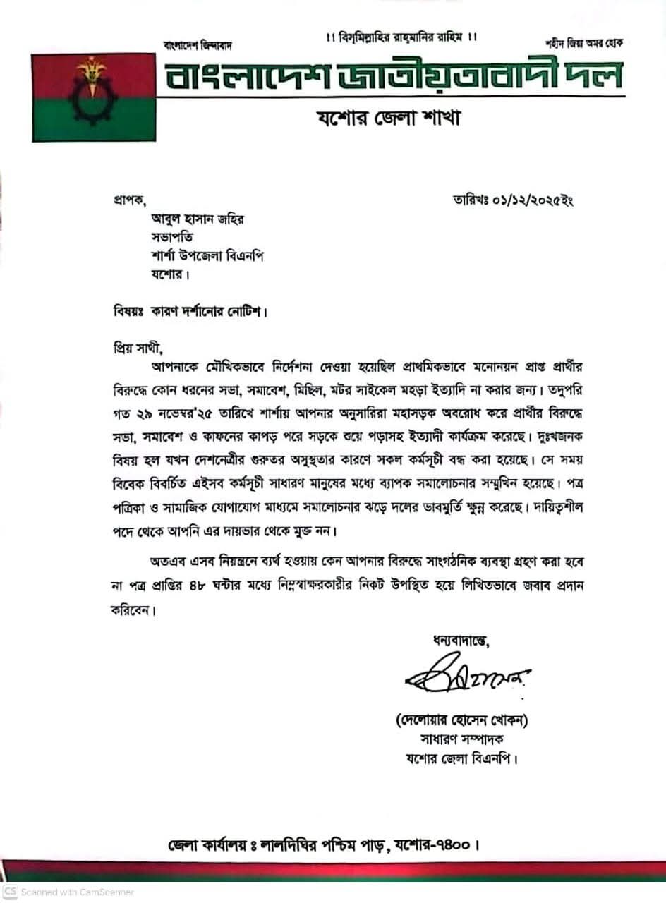 বিষয়টি জানতে জেলা বিএনপির সাধারণ সম্পাদক দেলোয়ার হোসেন খোকনের সঙ্গে মুঠোফোনে যোগাযোগ করা হলে তিনি কারণ দর্শানোর নোটিশ জারির বিষয়টি নিশ্চিত করেন।