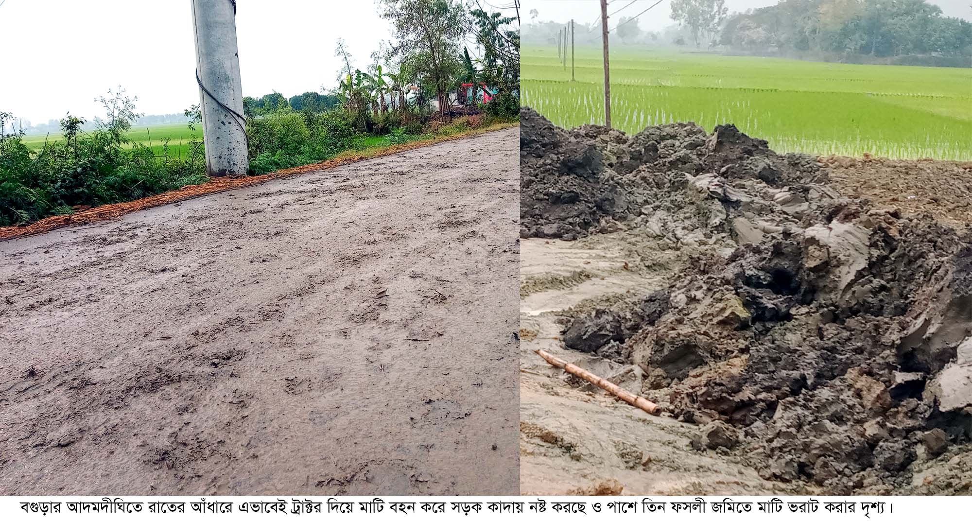 আদমদীঘিতে ট্রাক্টরের মাটিতে সড়কে কাদা- ঝুঁকি নিয়ে যান চলাচল